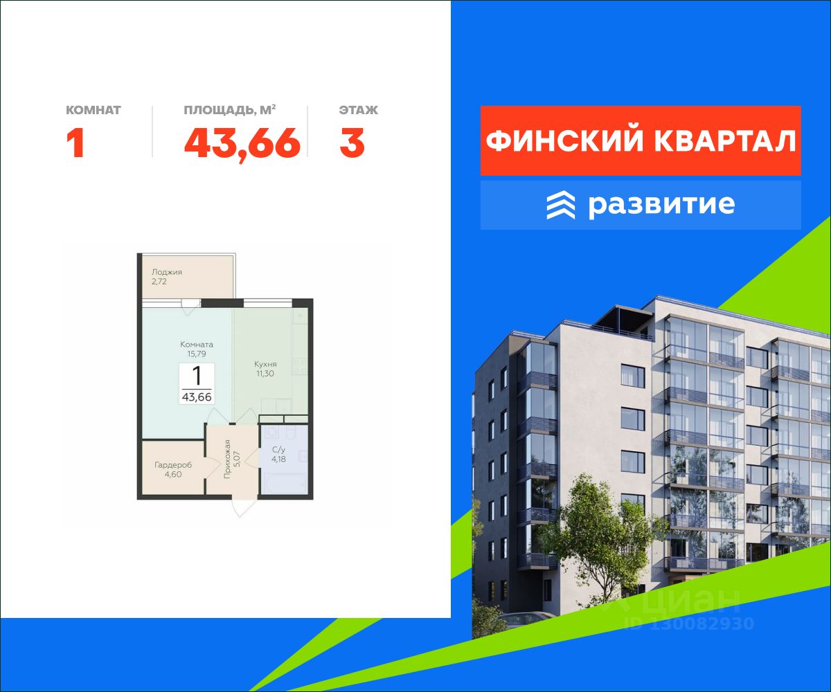 Продается квартира площадью 43.66 кв. м без отделки. Квартира расположена на 3 этаже 8 этажного дома, в жилом комплексе комфорт-класса "Финский Квартал".