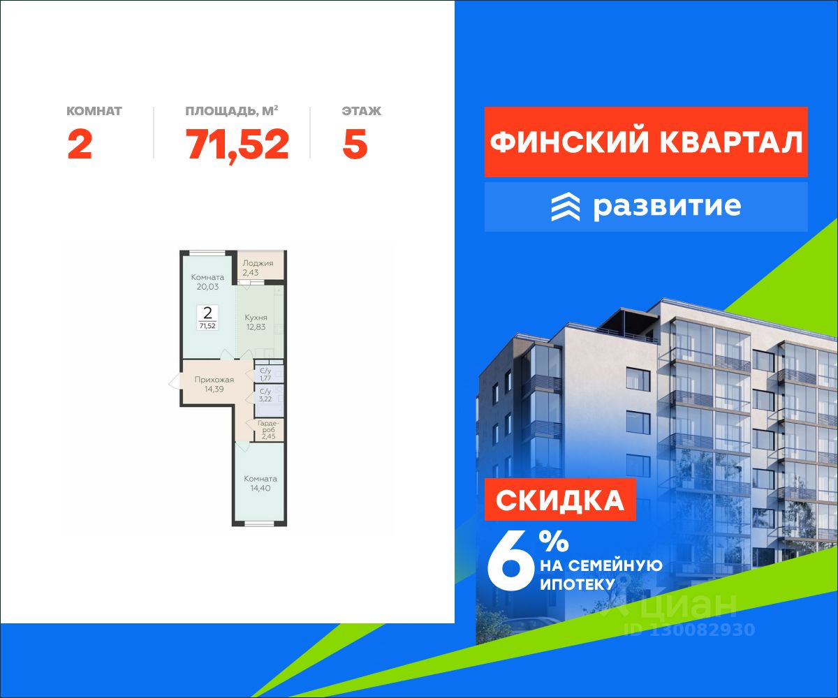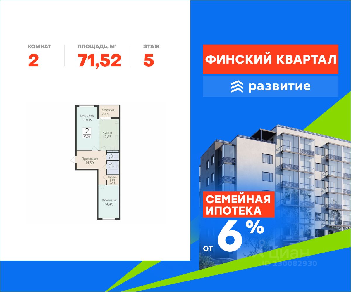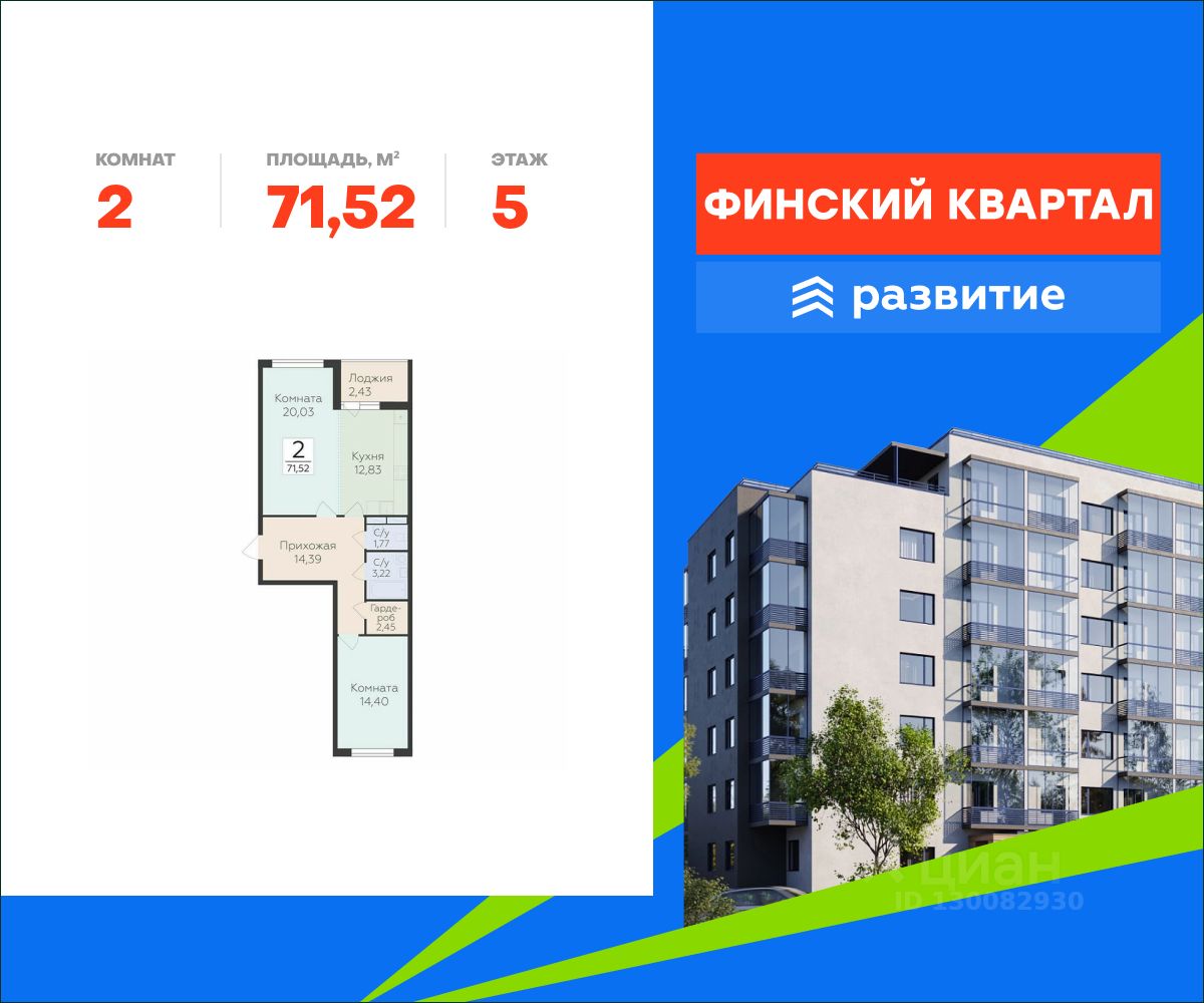 Продается квартира площадью 71.52 кв. м с отделкой white box. Квартира расположена на 5 этаже 7 этажного дома, в жилом комплексе комфорт-класса "Финский Квартал".