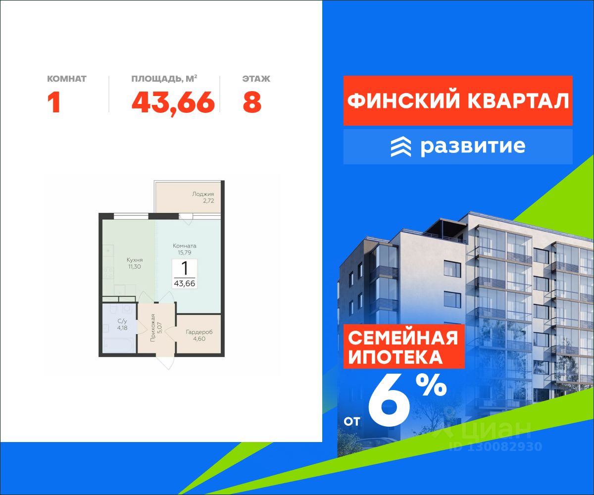 Продается квартира площадью 43.66 кв. м с отделкой white box. Квартира расположена на 8 этаже 8 этажного дома, в жилом комплексе комфорт-класса "Финский Квартал".