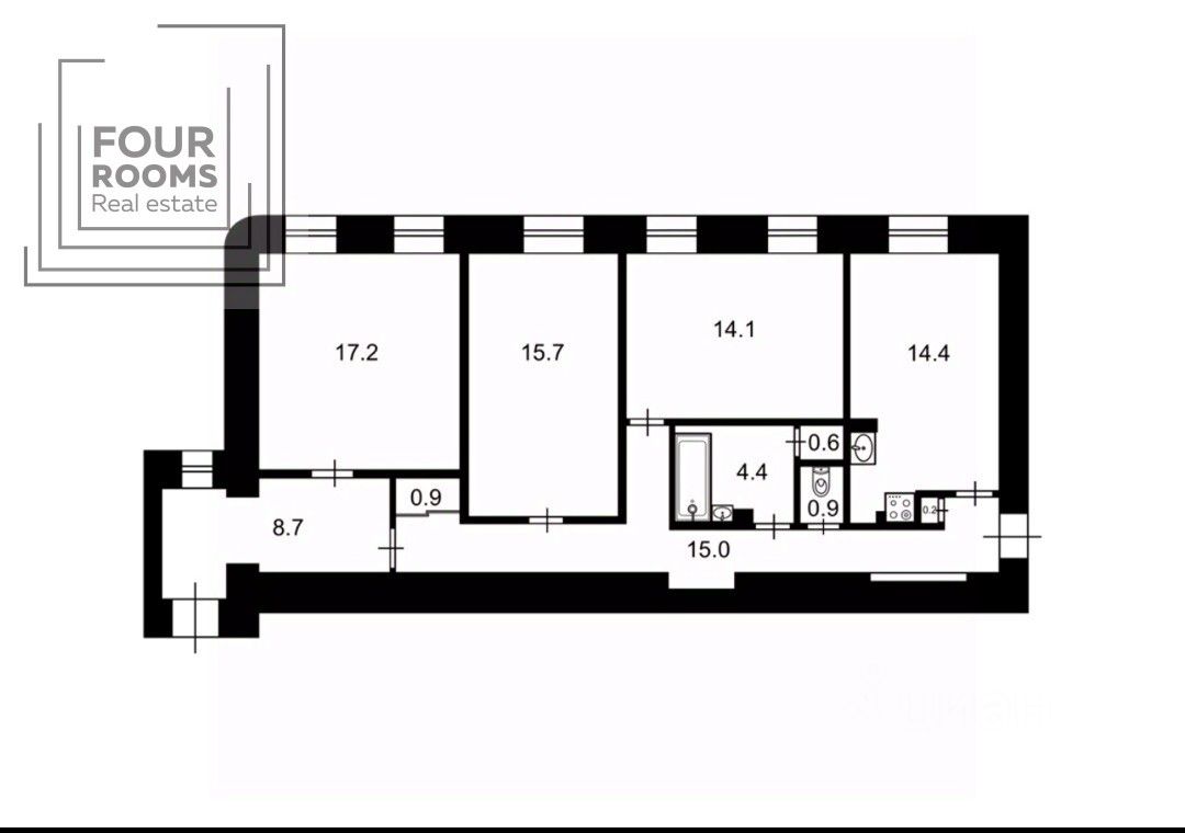 Удачная планировка с изолированными комнатами площадью 17.2, 15.7 и 14.1 кв.м. Просторная кухня 14.4 кв.м. и большой коридор 15.0 кв.м. создают ощущение простора.