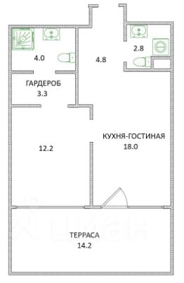 Кухня-гостиная 18 м2, спальня 12.2 м2