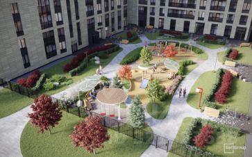 - На территории комплекса собственный парк, фонтаны, арт-объекты, игровые и спортивные площадки