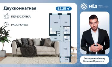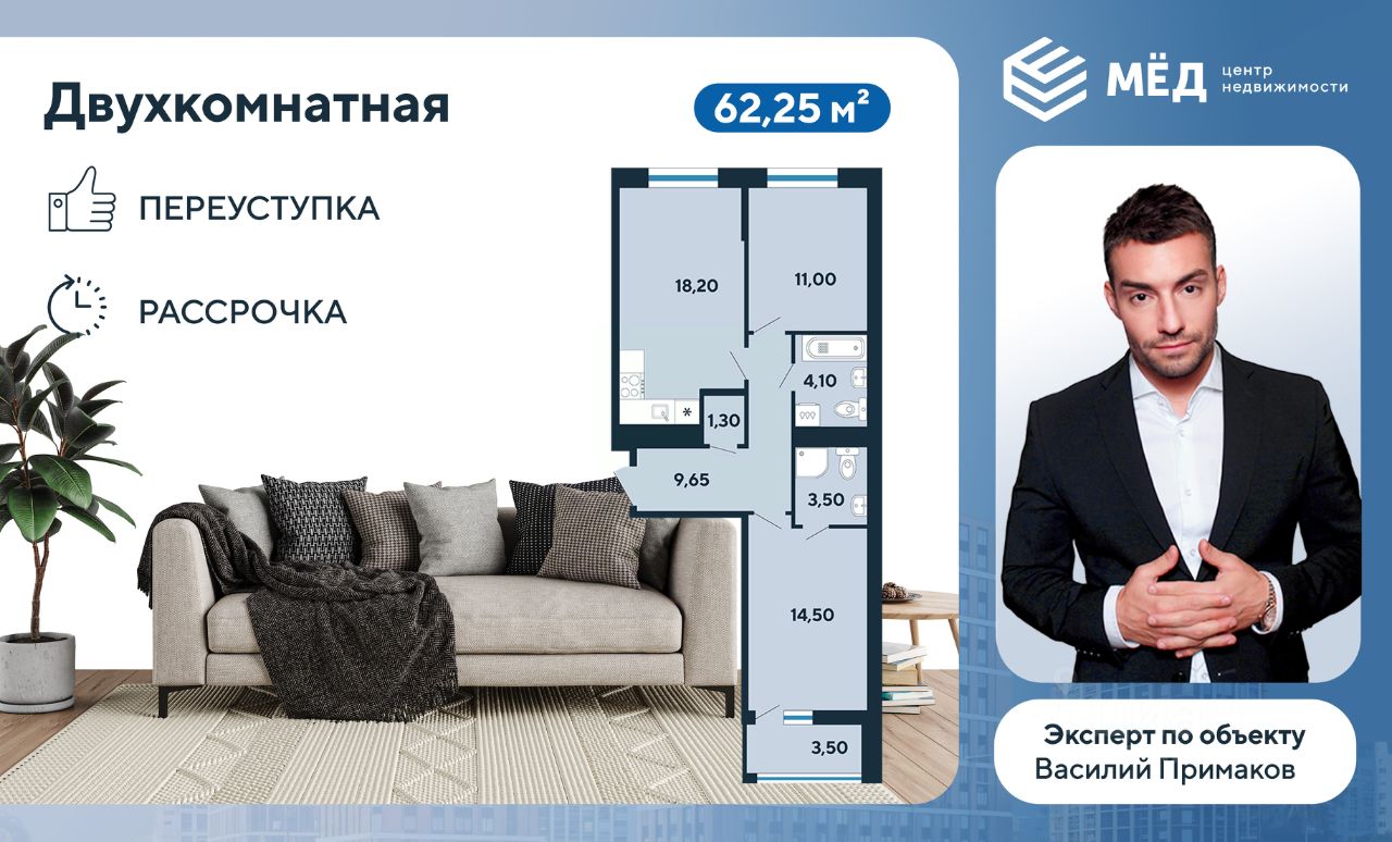 - Общая площадь - 62,25 кв.м без учета лоджии