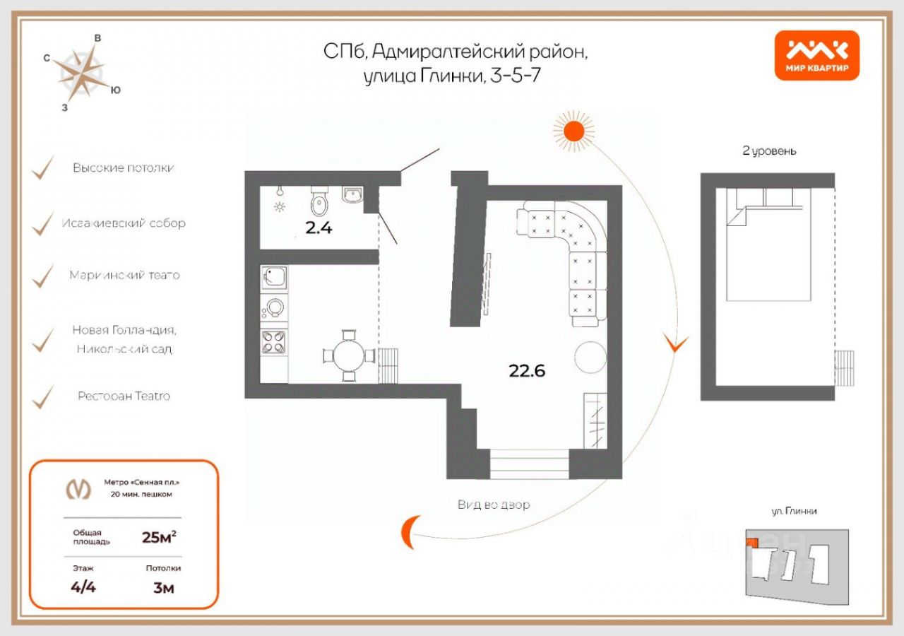 Арт. 116181752 Дом расположен в минуте пешей прогулки до Мариинского театра оперы и балета, одной из главных культурных доминант Санкт-Петербурга. В 10 минутах пешком находится памятник индустриальной архитектуры остров Новая Голландия. В целом в ближайшем окружении рестораны, бутики, исторические памятники, музеи и соборы — это, безусловно, очень особенная часть города. До аэропорта "Пулково" 30 минут на машине, до ЗСД — 13 минут. В трех минутах пешком строится станция "Театральная", открытие которой запланировано на 20252026 г.