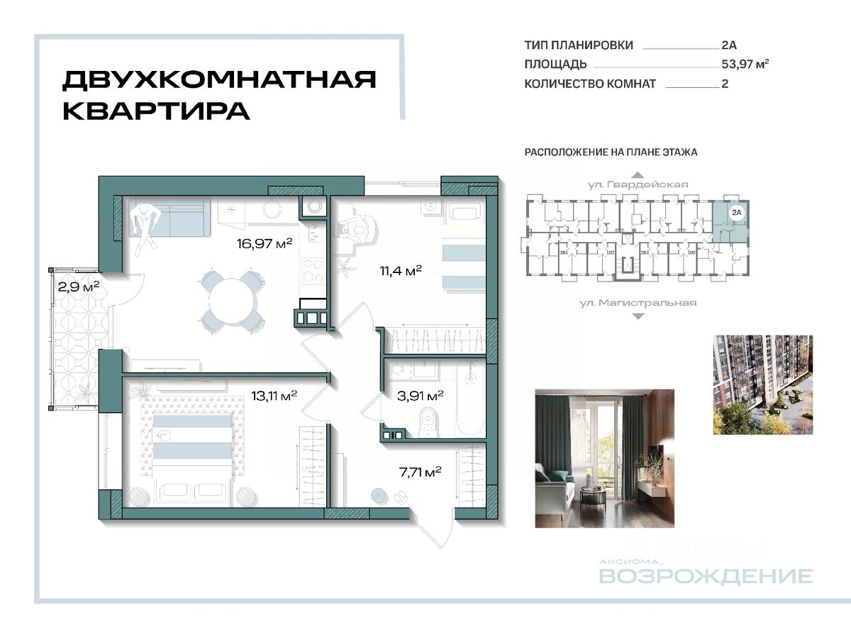 Продаётся 2-комнатная квартира в строящемся доме (Дом 6), срок сдачи: I-кв. 2028, общей площадью 53.97 кв.м., на 7 этаже. Новый клубный дом "Аксиома.Возрождение" от застройщика "Аксиома" расположен по адресу: г. Кировск, ул. Красных Сосен, 6