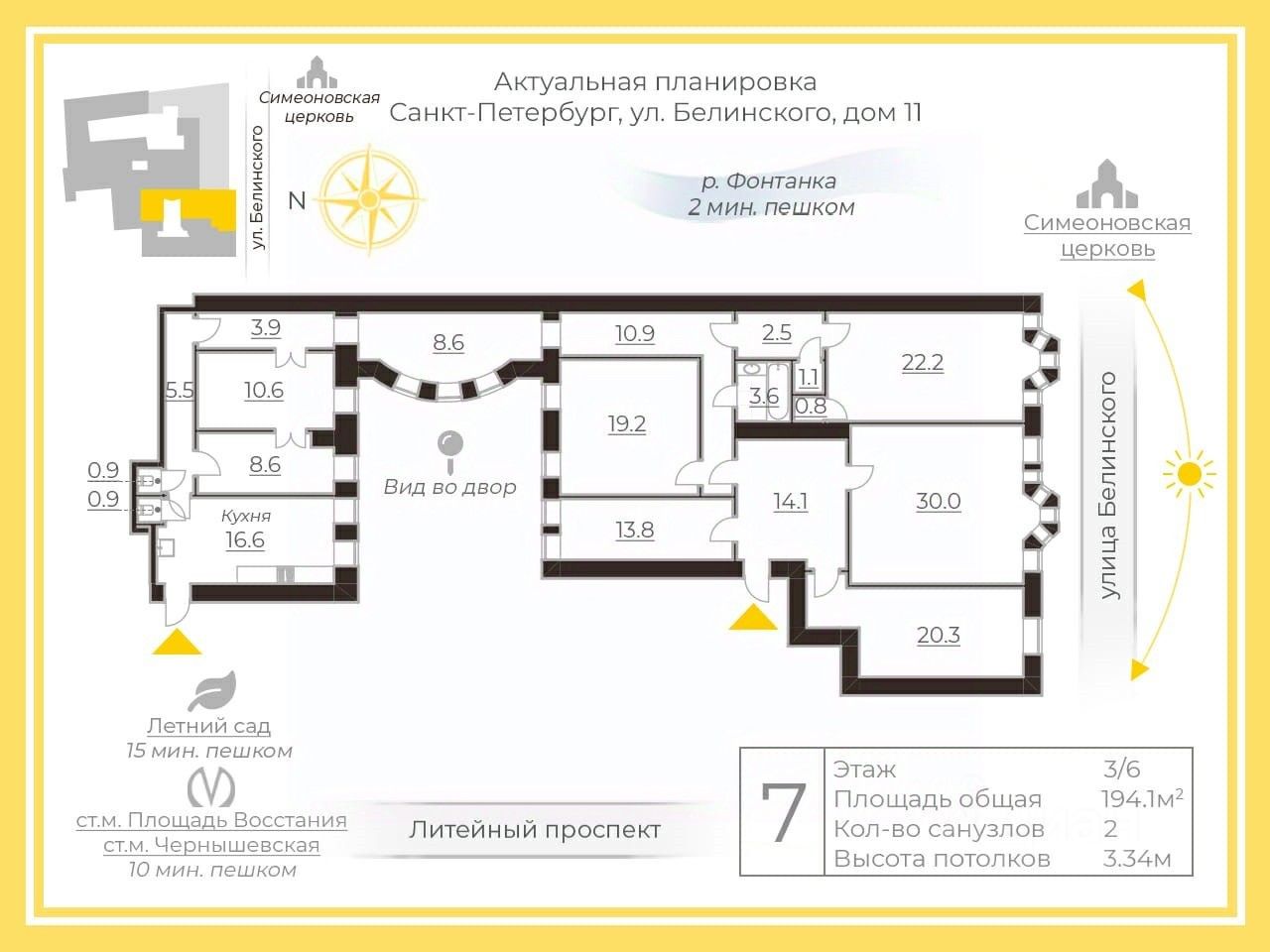 В  пешей доступности  Лeтний cад, Двopцoвая плoщaдь, Мapсoво поле, Mихайловский зaмoк, Двоpeц баpoна Штиглица, Русский Музей, Нева, набережные Фонтанки и Мойки, Heвcкий пpоспект.