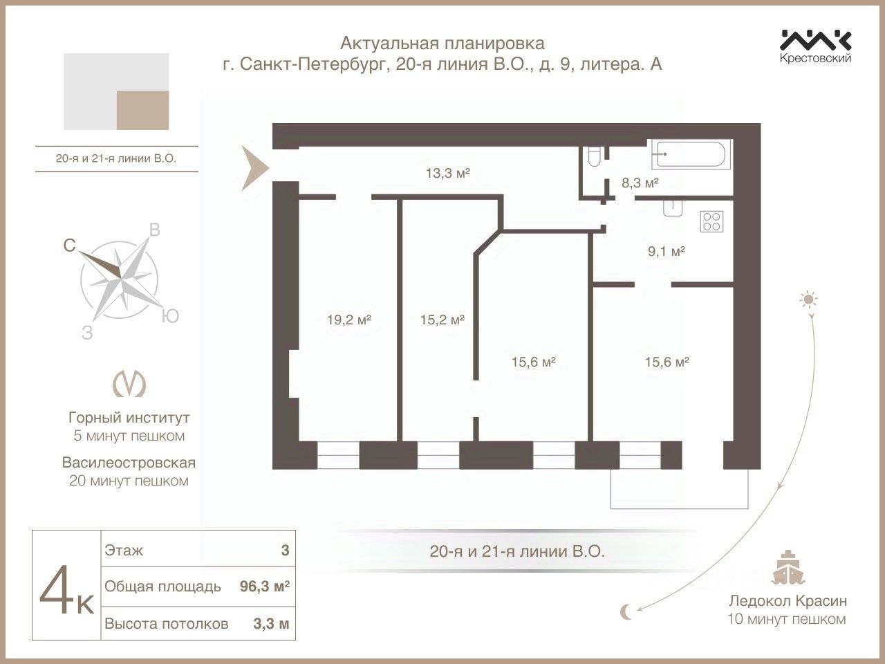 Локация объединяет историческое наследие с современным комфортом: в двух минутах — Большой проспект В.О., в шести минутах — метро "Горный институт". Живописная набережная Лейтенанта Шмидта и ледокол "Красин" создают особую атмосферу для прогулок. Рядом есть всё необходимое для жизни: супермаркеты, кофейни, рестораны и многое другое.