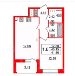 Общая площадь вместе с балконом, получается - 43,57 кв.м.