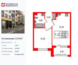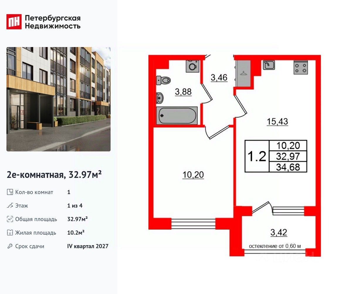 Удобная, классическая, функциональная европланировка, большая кухня-гостиная 15.43 м², вместительная прихожая 3.46 м². Общая площадь квартиры - 32.97 м², жилая 10.2 м², высота потолка 2.77 м.