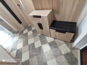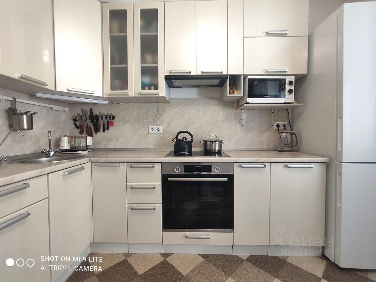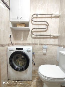 В цену входит встроенная кухня с техникой (включая духовой шкаф фирмы Bosch), мебель в прихожей, навесные шкафы и шкаф под раковину в ванной.