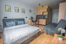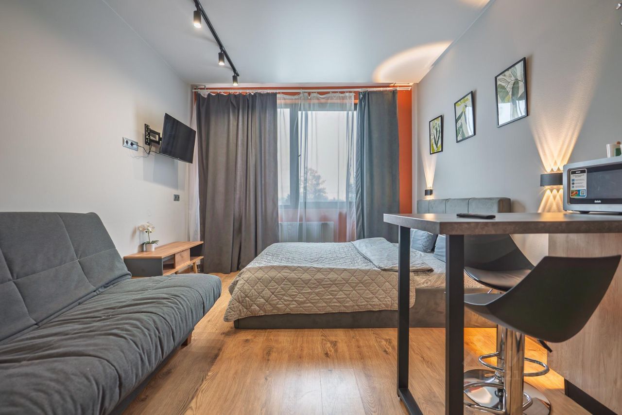 - апартаменты полностью укомплектованы и готовы к проживанию или сдаче в аренду: есть двуспальная кровать + дополнительной спальное место (диван-кровать), оборудованная кухонная зона, телевизор, вместительный шкаф, стиральная машина,
