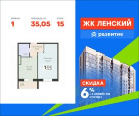 В продаже квартира площадью 35.05 кв. м с отделкой white box на 15 этаже 16 этажного дома. Квартира находится в 4834 корпусе: