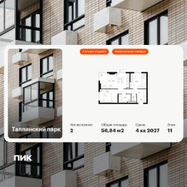Продаётся 2-комн. квартира площадью 56,84 кв.м на 11 этаже 12 этажного дома (Корпус 4.1, Секция 4) проекта ПИК Таллинский парк. Светлый просторный подъезд на уровне земли, функциональная планировка, большие окна, c отделкой.