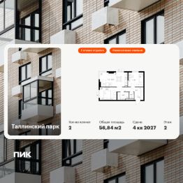 Продаётся 2-комн. квартира площадью 56,84 кв.м на 2 этаже 12 этажного дома (Корпус 4.1, Секция 4) проекта ПИК Таллинский парк. Светлый просторный подъезд на уровне земли, функциональная планировка, большие окна, c отделкой.