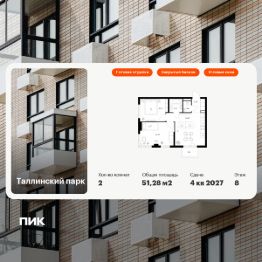 Продаётся 2-комн. квартира площадью 51,28 кв.м на 8 этаже 12 этажного дома (Корпус 4.1, Секция 3) проекта ПИК Таллинский парк. Светлый просторный подъезд на уровне земли, функциональная планировка, большие окна, c отделкой.