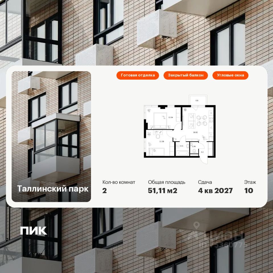 Продаётся 2-комн. квартира площадью 51,11 кв.м на 10 этаже 12 этажного дома (Корпус 4.1, Секция 4) проекта ПИК Таллинский парк. Светлый просторный подъезд на уровне земли, функциональная планировка, большие окна, c отделкой.