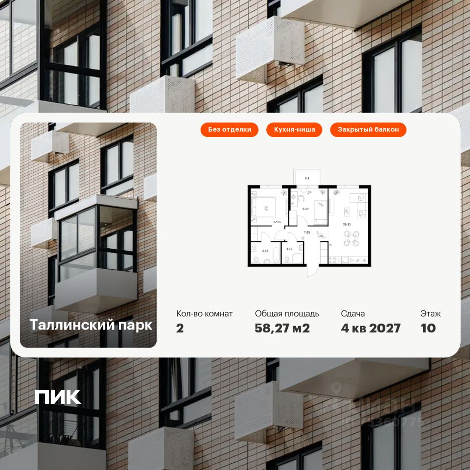 Продаётся 2-комн. квартира площадью 58,27 кв.м на 10 этаже 12 этажного дома (Корпус 4.1, Секция 1) проекта ПИК Таллинский парк. Светлый просторный подъезд на уровне земли, функциональная планировка, большие окна, без отделки.