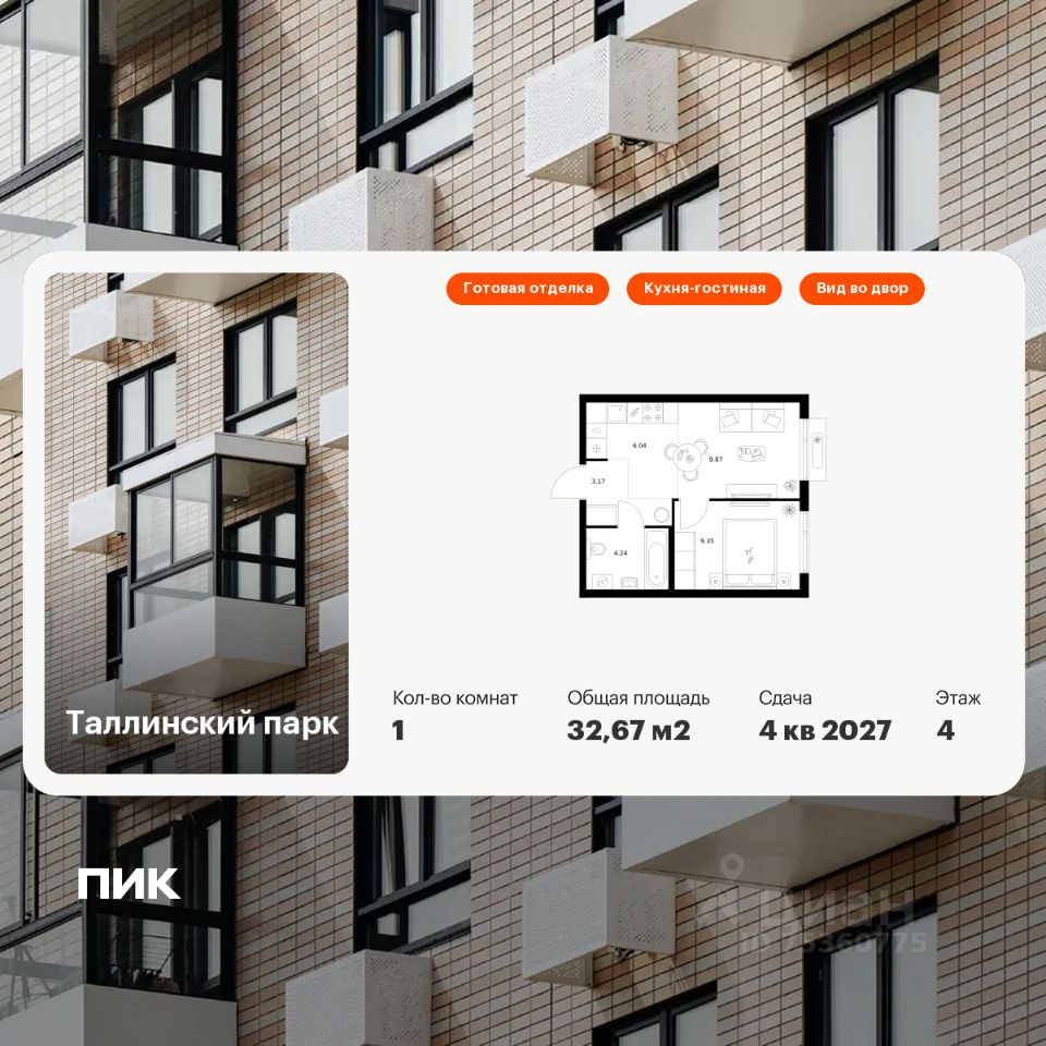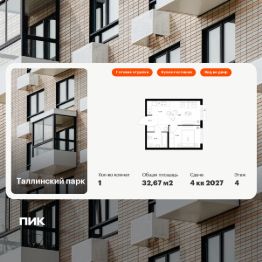 Продаётся 1-комн. квартира площадью 32,67 кв.м на 4 этаже 12 этажного дома (Корпус 4.1, Секция 2) проекта ПИК Таллинский парк. Светлый просторный подъезд на уровне земли, функциональная планировка, большие окна, c отделкой.