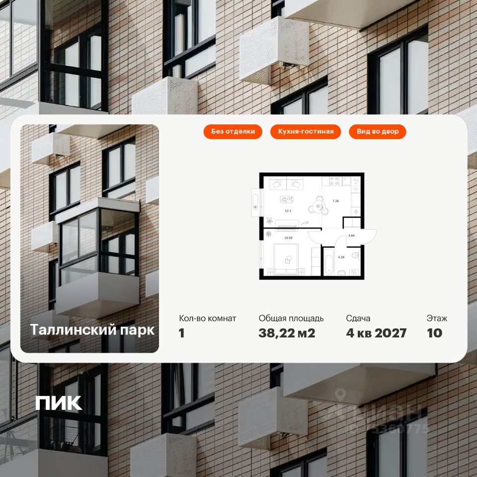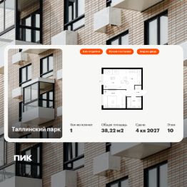 Продаётся 1-комн. квартира площадью 38,22 кв.м на 10 этаже 12 этажного дома (Корпус 4.1, Секция 1) проекта ПИК Таллинский парк. Светлый просторный подъезд на уровне земли, функциональная планировка, большие окна, без отделки.