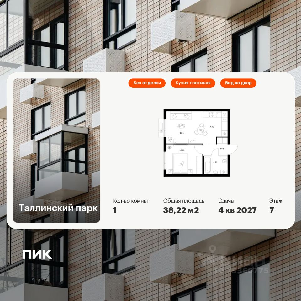 Продаётся 1-комн. квартира площадью 38,22 кв.м на 7 этаже 12 этажного дома (Корпус 4.1, Секция 1) проекта ПИК Таллинский парк. Светлый просторный подъезд на уровне земли, функциональная планировка, большие окна, без отделки.