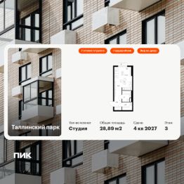 Продаётся квартира-студия площадью 28,89 кв.м на 3 этаже 12 этажного дома (Корпус 4.1, Секция 2) проекта ПИК Таллинский парк. Светлый просторный подъезд на уровне земли, функциональная планировка, большие окна, c отделкой.