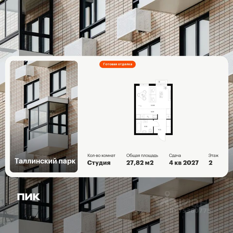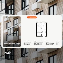 Продаётся квартира-студия площадью 27,82 кв.м на 2 этаже 12 этажного дома (Корпус 4.1, Секция 3) проекта ПИК Таллинский парк. Светлый просторный подъезд на уровне земли, функциональная планировка, большие окна, c отделкой.