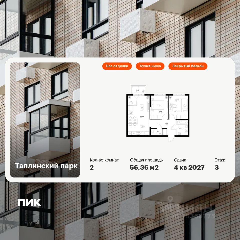 Продаётся 2-комн. квартира площадью 56,36 кв.м на 3 этаже 12 этажного дома (Корпус 4.2, Секция 1) проекта ПИК Таллинский парк. Светлый просторный подъезд на уровне земли, функциональная планировка, большие окна, без отделки.