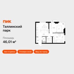 Продаётся 2-комн. квартира площадью 46,01 кв.м на 2 этаже 12 этажного дома (Корпус 4.2, Секция 1) проекта ПИК Таллинский парк. Светлый просторный подъезд на уровне земли, функциональная планировка, большие окна, без отделки.