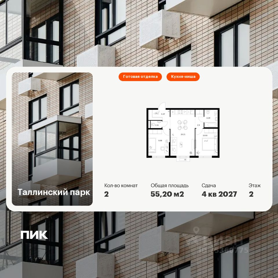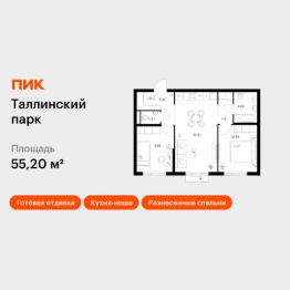 Продаётся 2-комн. квартира площадью 55,2 кв.м на 2 этаже 12 этажного дома (Корпус 4.1, Секция 4) проекта ПИК Таллинский парк. Светлый просторный подъезд на уровне земли, функциональная планировка, большие окна, c отделкой.