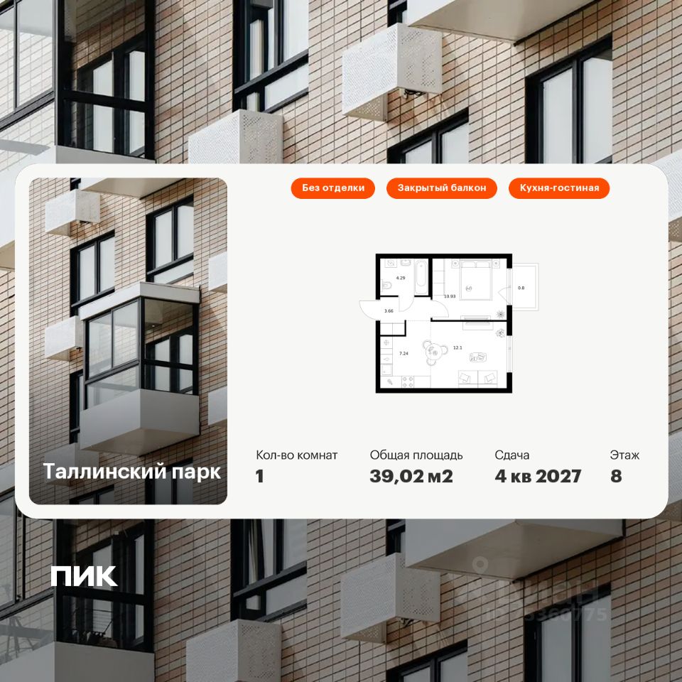 Продаётся 1-комн. квартира площадью 39,02 кв.м на 8 этаже 12 этажного дома (Корпус 4.1, Секция 1) проекта ПИК Таллинский парк. Светлый просторный подъезд на уровне земли, функциональная планировка, большие окна, без отделки.