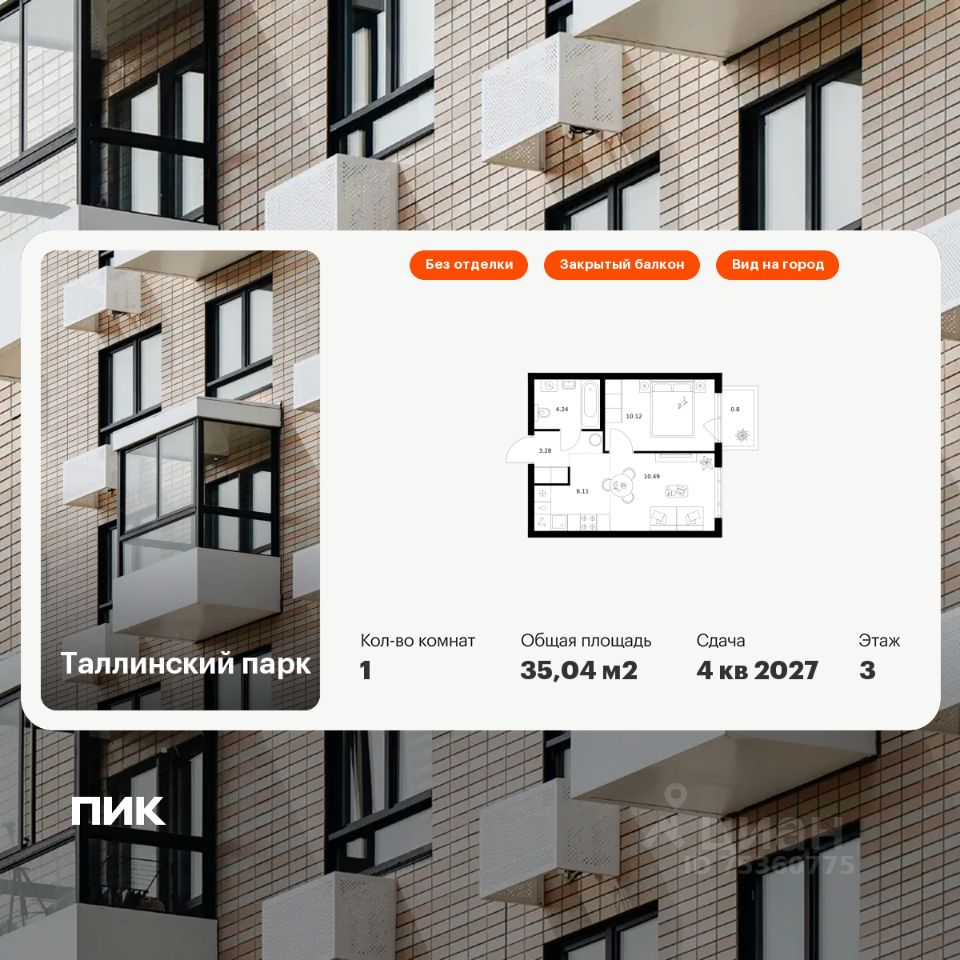 Продаётся 1-комн. квартира площадью 35,04 кв.м на 3 этаже 12 этажного дома (Корпус 4.1, Секция 1) проекта ПИК Таллинский парк. Светлый просторный подъезд на уровне земли, функциональная планировка, большие окна, без отделки.