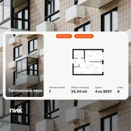 Продаётся 1-комн. квартира площадью 34,24 кв.м на 6 этаже 12 этажного дома (Корпус 4.1, Секция 1) проекта ПИК Таллинский парк. Светлый просторный подъезд на уровне земли, функциональная планировка, большие окна, без отделки.