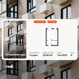 Продаётся квартира-студия площадью 25,9 кв.м на 8 этаже 12 этажного дома (Корпус 4.1, Секция 4) проекта ПИК Таллинский парк. Светлый просторный подъезд на уровне земли, функциональная планировка, большие окна, c отделкой.