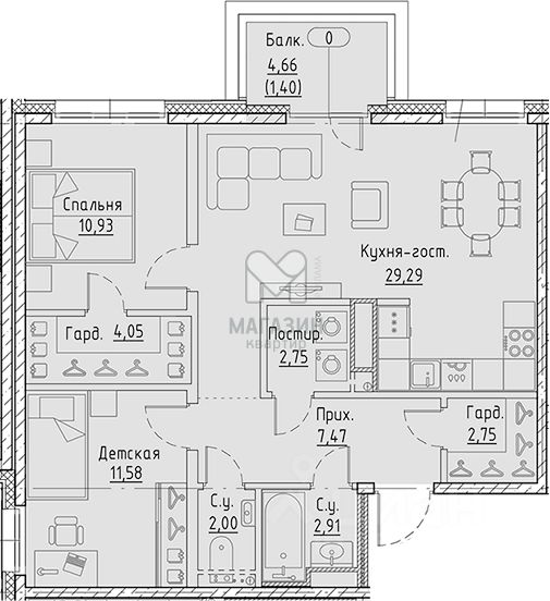 Просторная кухня-гостиная 29 м.кв. и две изолированные спальни.
