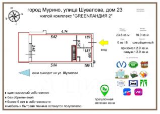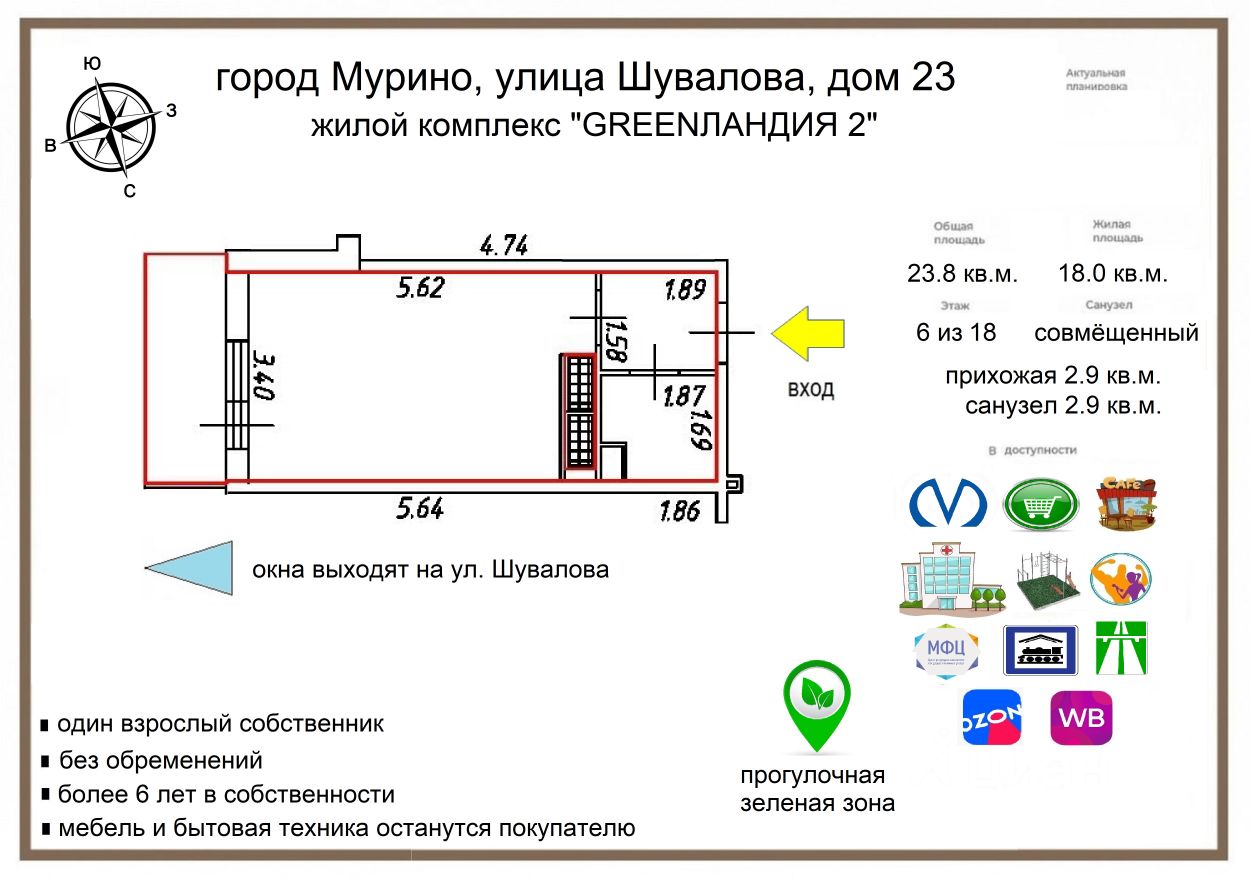 - площадь 23.8 кв.м. без учета балкона;