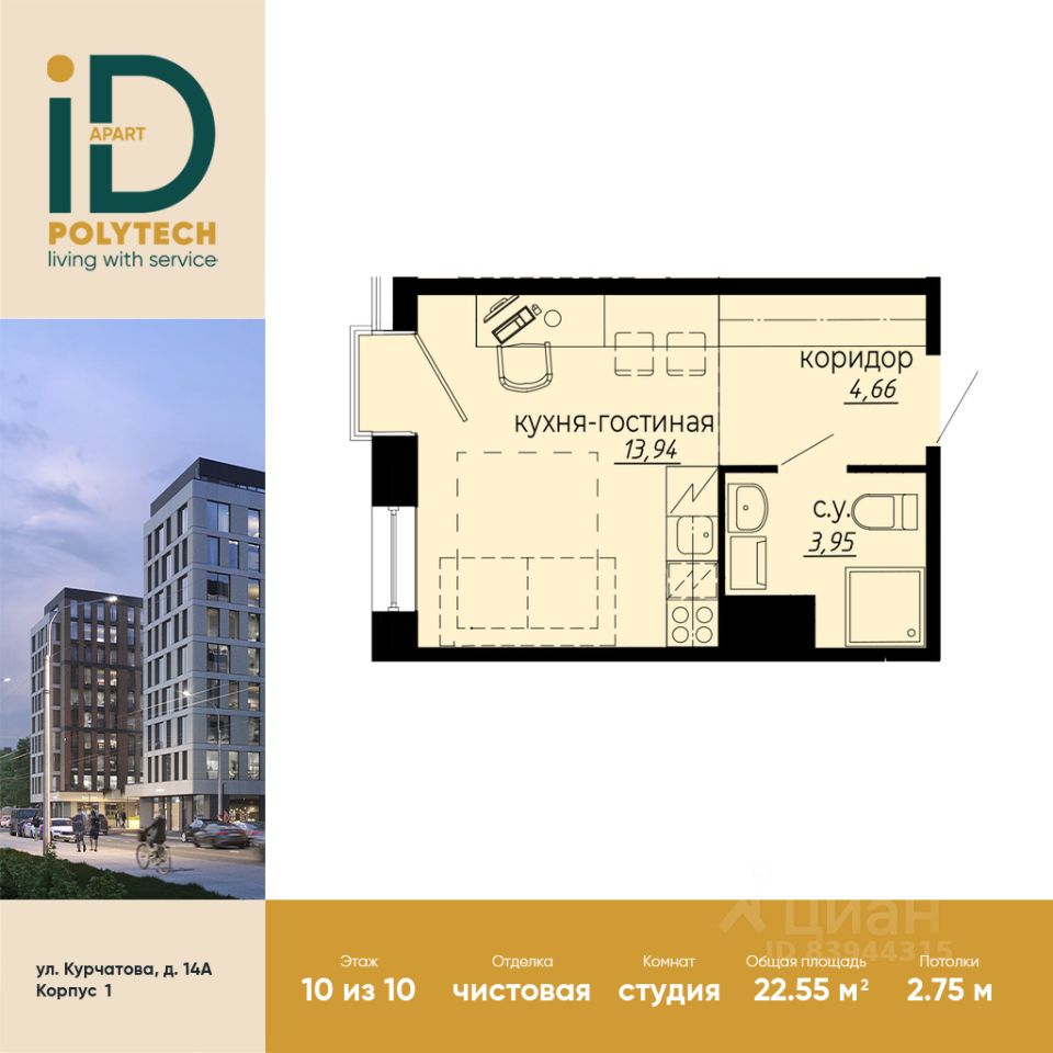 В продаже стильная эргономичная студия с готовой отделкой в эксклюзивном апарт-комплексе iD Polytech.