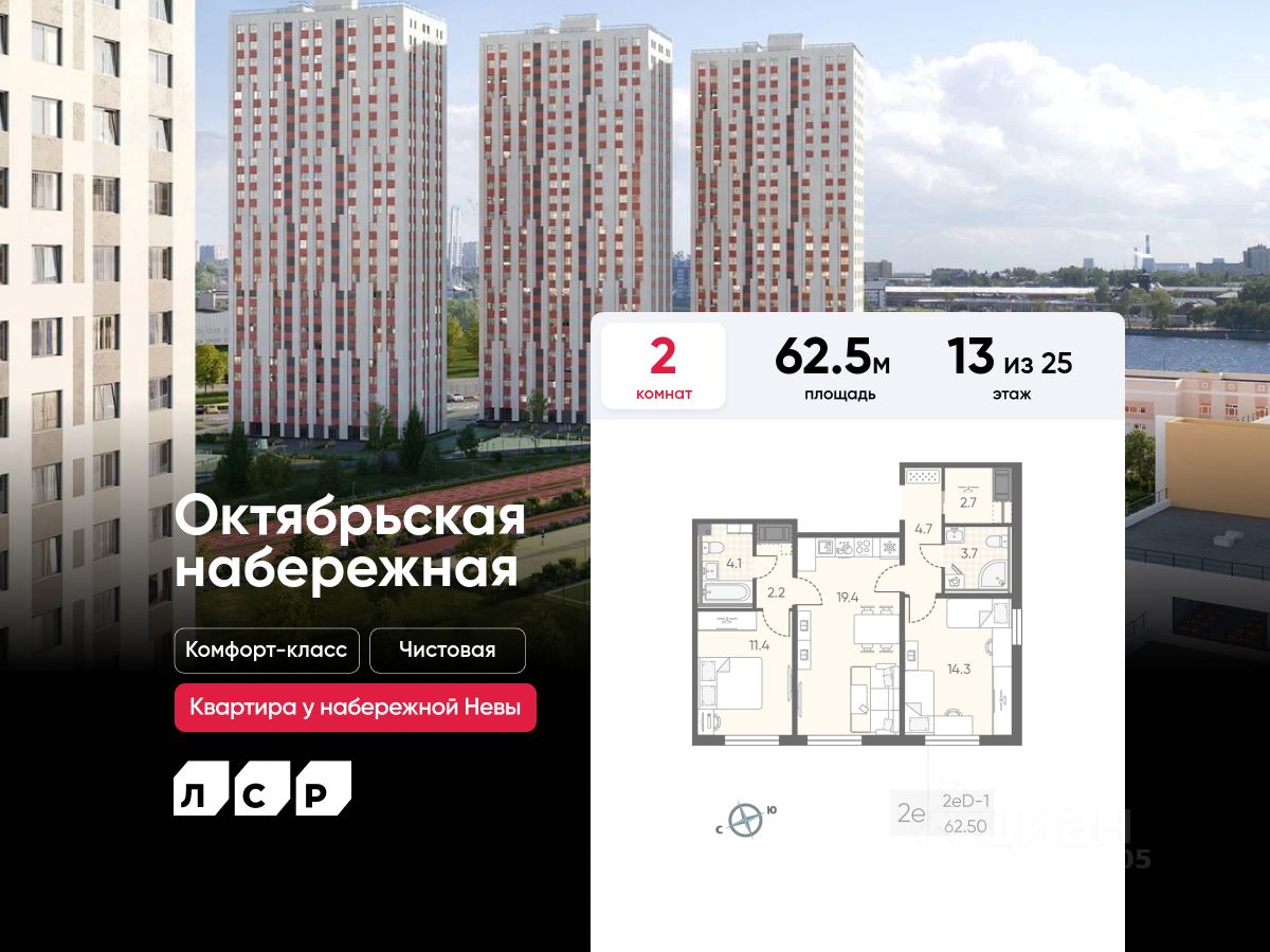Продается 2-комнатная квартира в ЖК "Октябрьская набережная" на 13 этаже. Общая площадь составляет 62.50 кв. м. Квартира с чистовой отделкой . Жилой комплекс "Октябрьская набережная" располагается по адресу Санкт-Петербург, Невский.