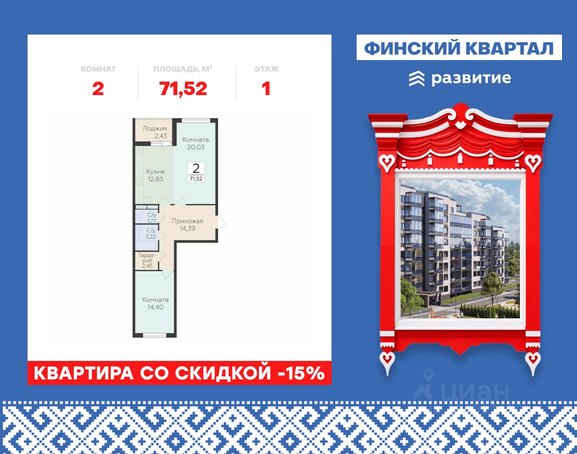 "Продается квартира площадью 71.52 кв. м без отделки. Квартира расположена на 1 этаже 8 этажного дома, в жилом комплексе комфорт-класса "Финский Квартал".