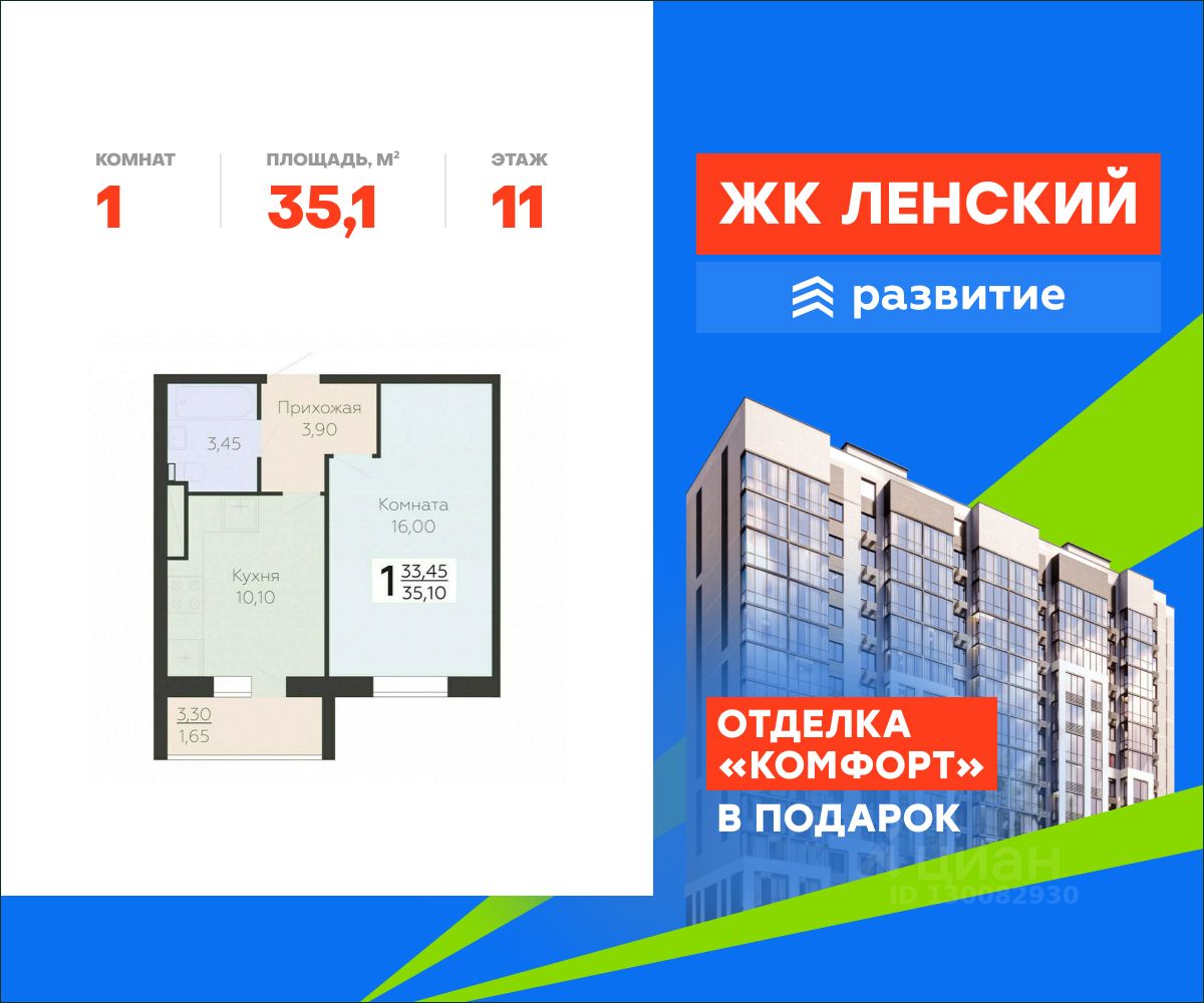 В продаже квартира площадью 35.10 кв. м с отделкой на 11 этаже 16 этажного дома. Квартира находится в 4835 корпусе: