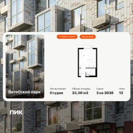 Продаётся квартира-студия площадью 23,3 кв.м на 12 этаже 12 этажного дома (Корпус 7, Секция 1) проекта ПИК Витебский парк. Светлый просторный подъезд на уровне земли, функциональная планировка, большие окна, c отделкой.