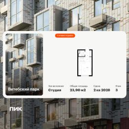 Продаётся квартира-студия площадью 23,9 кв.м на 3 этаже 12 этажного дома (Корпус 7, Секция 4) проекта ПИК Витебский парк. Светлый просторный подъезд на уровне земли, функциональная планировка, большие окна, c отделкой.