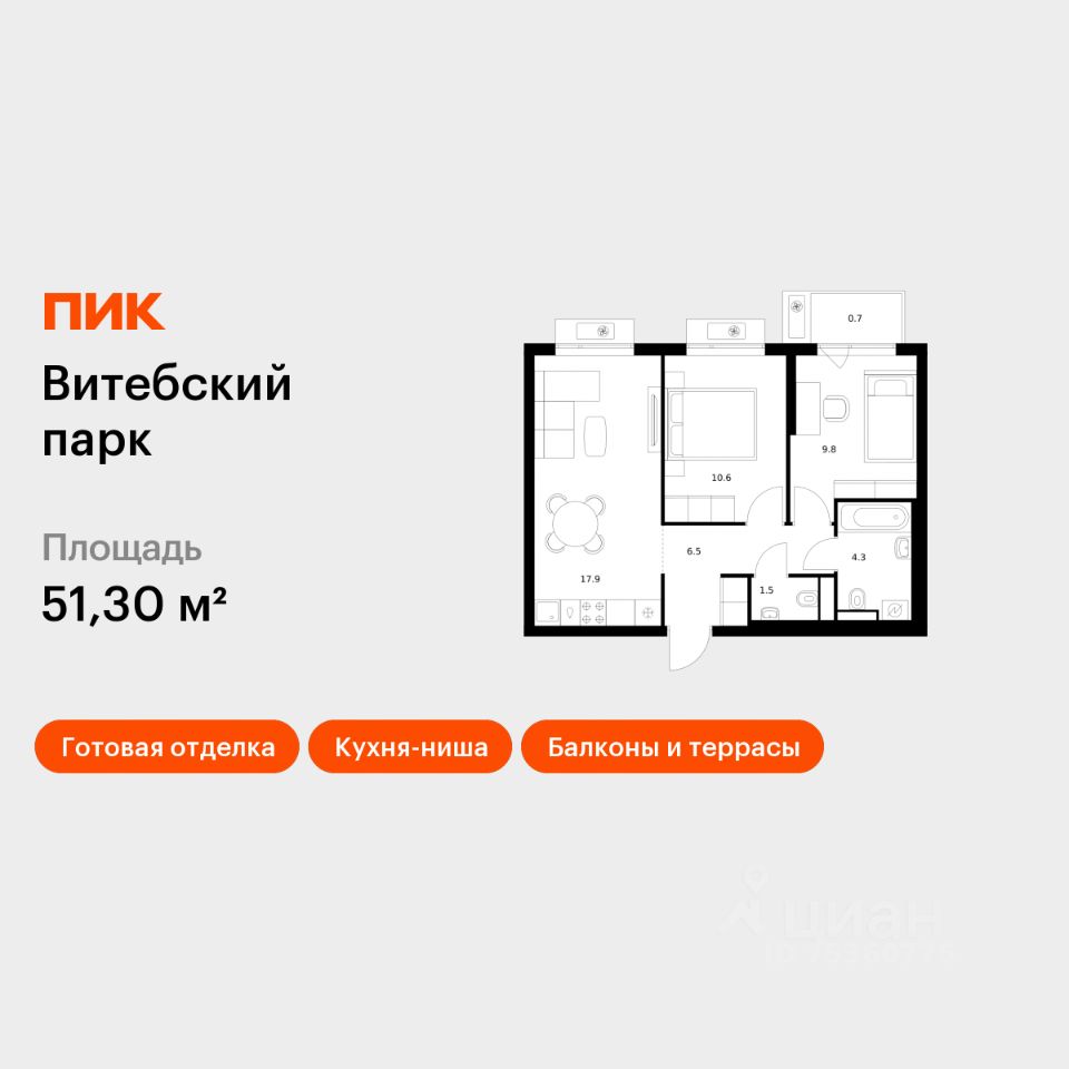 Продаётся 2-комн. квартира площадью 51,3 кв.м на 10 этаже 12 этажного дома (Корпус 6, Секция 4) проекта ПИК Витебский парк. Светлый просторный подъезд на уровне земли, функциональная планировка, большие окна, c отделкой.