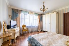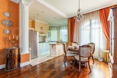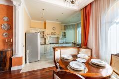 В квартире выполнен ремонт с применением высококачественных материалов. Кухня Martini Mobili, обеденная группа Bianchi, спальня Silik, гардеробная Sfarzo Mobili плитка Versace, дубовая лестница с коваными перилами, выполненная мастерами, работавшими над Константиновским дворцом. Мебель и декор были собраны по всему миру: в Италии, Франции, Португалии, Швеции и других странах. Техника от домашней аудиосистемы до кондиционеров высококлассного японского производителя.
