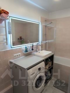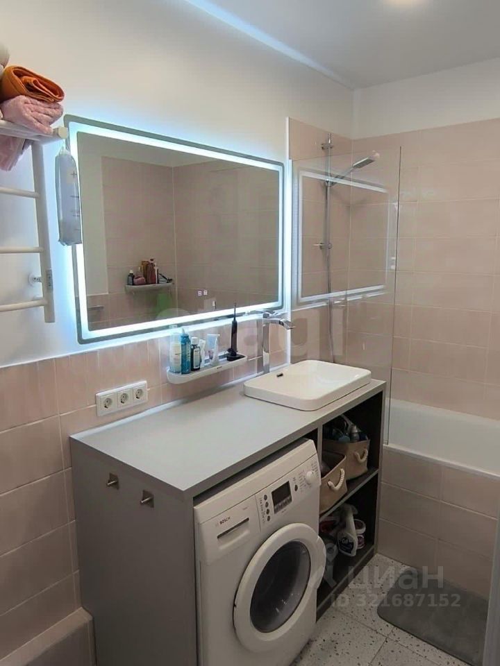 Cовмещенный санузел оформлен в светлых тонах, оснащен современной сантехникой и стиральной машиной.