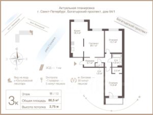 Евро-планировка 88.5 м²: две спальни (одна с гардеробной), светлая кухня-гостиная 38.5 м², два санузла, лоджия.