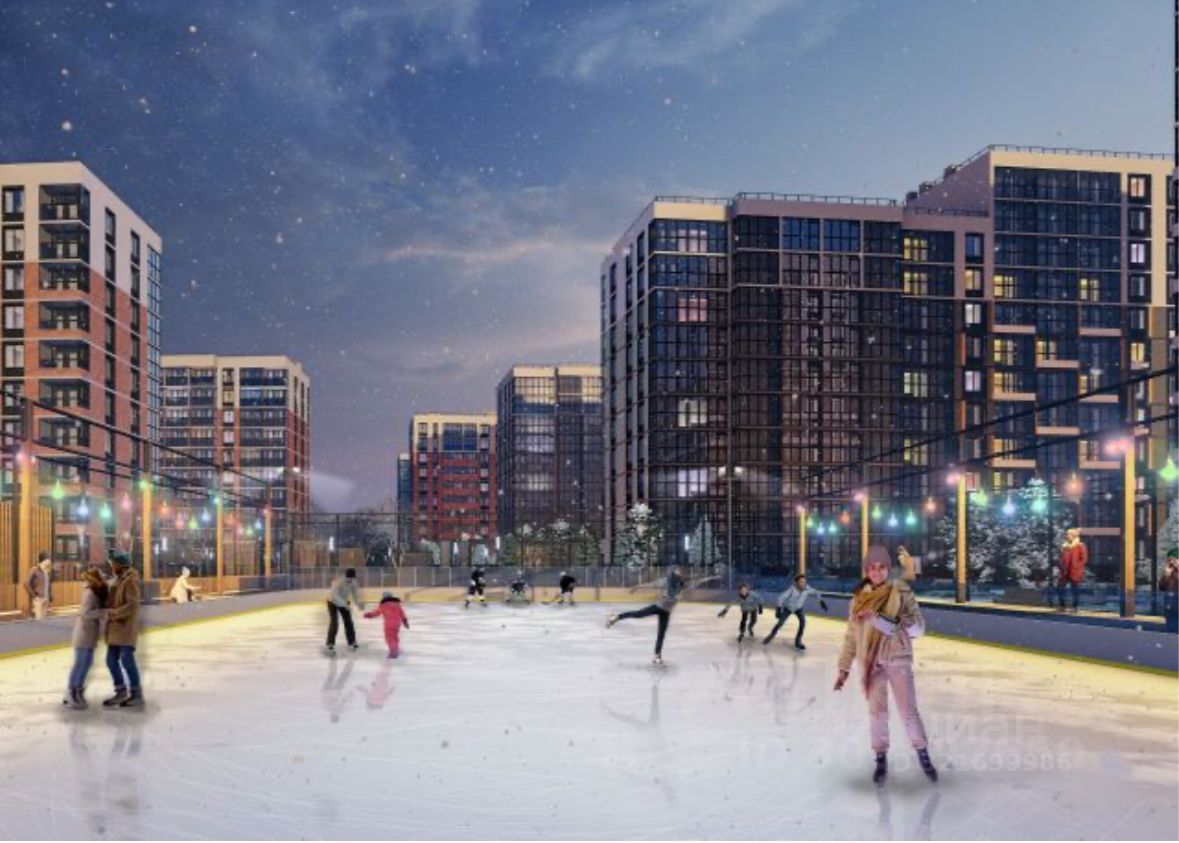 Пешеходный бульвар с воздушным мостом, километровая велодорожка, зимний каток и футбольное поле.