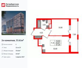 Удобная, классическая, функциональная европланировка, большая кухня-гостиная 15.49 м², вместительная прихожая 4.21 м². Общая площадь квартиры - 33.61 м², жилая 10.5 м², высота потолка 2.75 м.