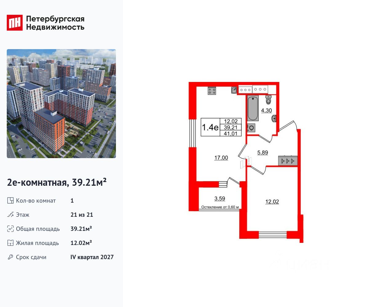 Удобная, классическая, функциональная европланировка, большая кухня-гостиная 17 м², просторная прихожая 5.89 м². Общая площадь квартиры - 39.21 м², жилая 12.02 м², высота потолка 3 м.