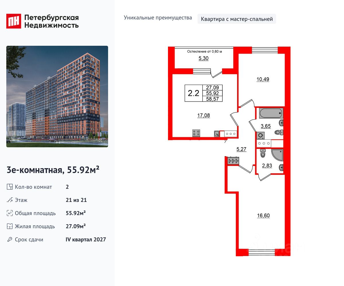 Уникальная, функциональная европланировка, большая кухня-гостиная 17.08 м², вместительная прихожая 5.27 м². Общая площадь квартиры - 55.92 м², жилая 27.09 м², высота потолка 3 м.