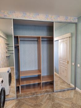 В комнате встроенный вместительный шкаф, в котором продумано место для хранения пылесоса, гладильной доски, и чемоданов.